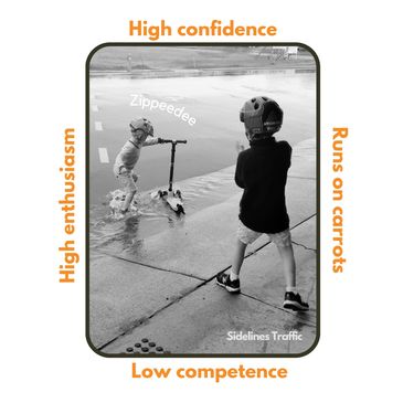 The Zippeedeeing scooter rider is short in stature and young in years. They have high enthusiasm, high confidence and low competence. They can run on carrots but prefer ice cream. They often have strong opinions and much prefer Zippeedeeing to walking.